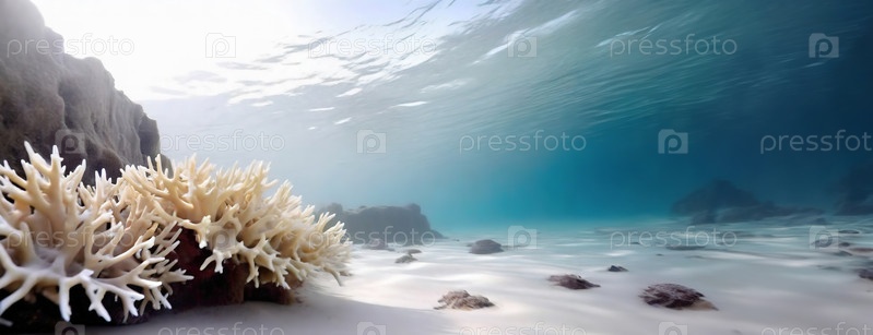 Подводная панорама мертвого белого отбеленного кораллового рифа с солнечным светом.Подводная панорама показывает подробный коралловый риф, прозрачная голубая вода.Мировая проблема