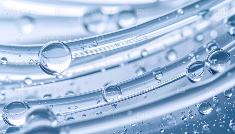 Макротипная гиалуроновая кислота или гелевая текстура с прозрачными водяными пузырями на стеклянных нитках, представляющие чистоту, увлажнение и науку о коже