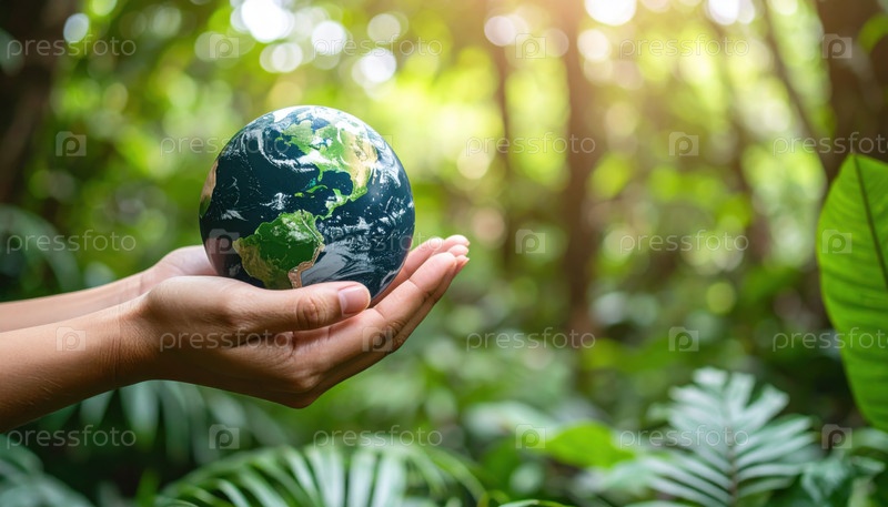 Руки нежно держат миниатюрную Землю в пышном лесу, символизирующем заботу об окружающей среде, глобальную ответственность, День Земли и устойчивую жизнь