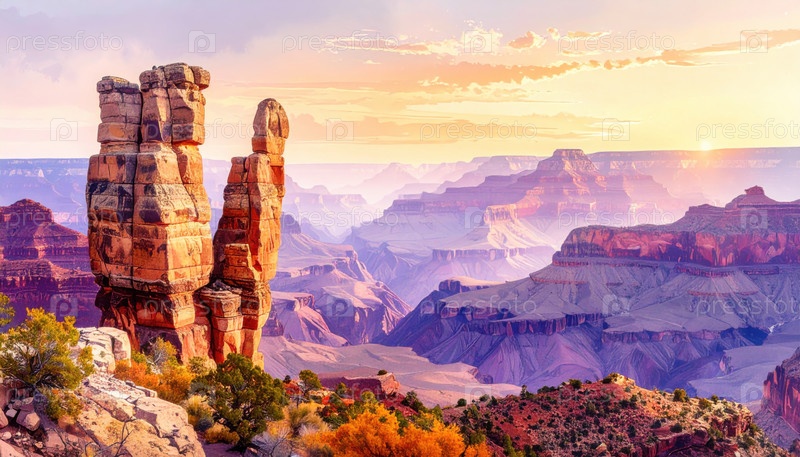Закат Гранд-Каньона с скальными образованиями и яркими оттенками, отражающими природные чудеса и популярное туристическое направление в Соединенных Штатах