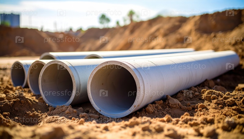 Большие бетонные трубы лежат на песчаной почве на стройплощадке, представляя собой развитие инфраструктуры и прогресс гражданского строительства