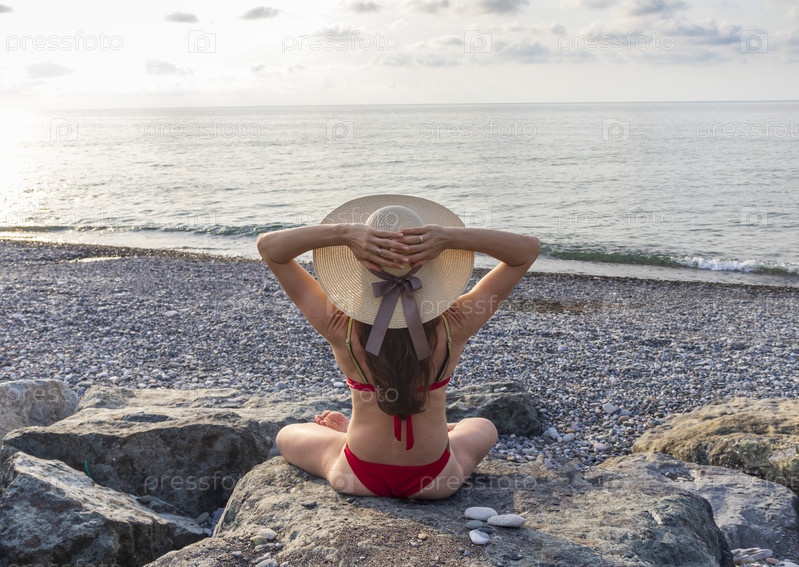Привлекательная женщина с длинными волосами, в красном бикини и соломенной шляпе на пляже, сидящая на большой скале, загорает