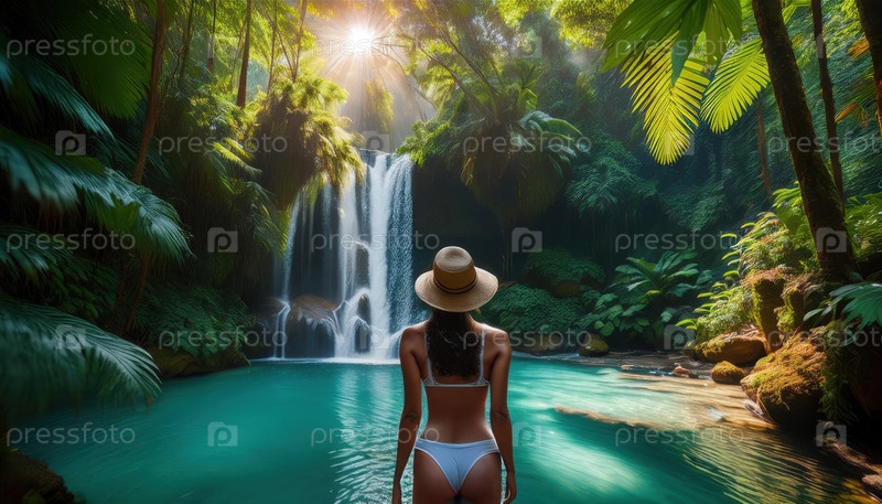 Женщина в бикини стоит перед водопадом джунглей с солнечным светом, фильтрующим тропические зеленые