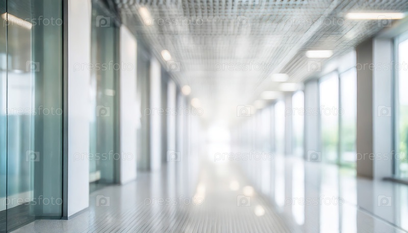 Размытый футуристический коридор больницы с гладкими стеклянными стенами и ярким освещением, вызывающим чистоту и высокие технологии