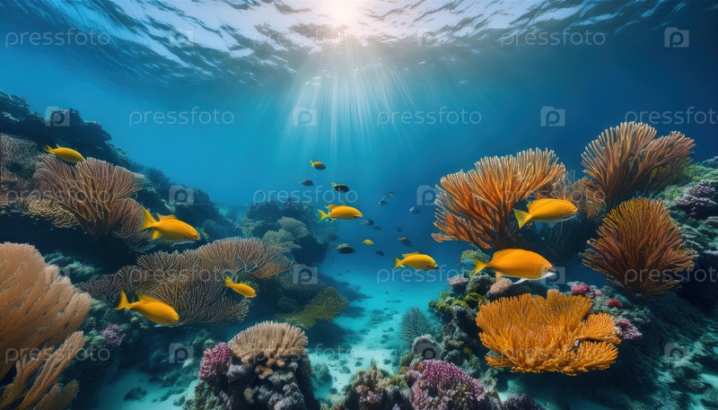 Красочные рифовые рыбы плавают среди ярких кораллов под чистой океанской водой, освещенной солнечным светом
