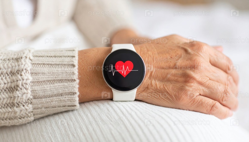 Умные часы на более старых запястьях отображают монитор сердечного ритма, символизирующий уход за пожилыми людьми, отслеживание здоровья и современные решения для самостоятельного старения