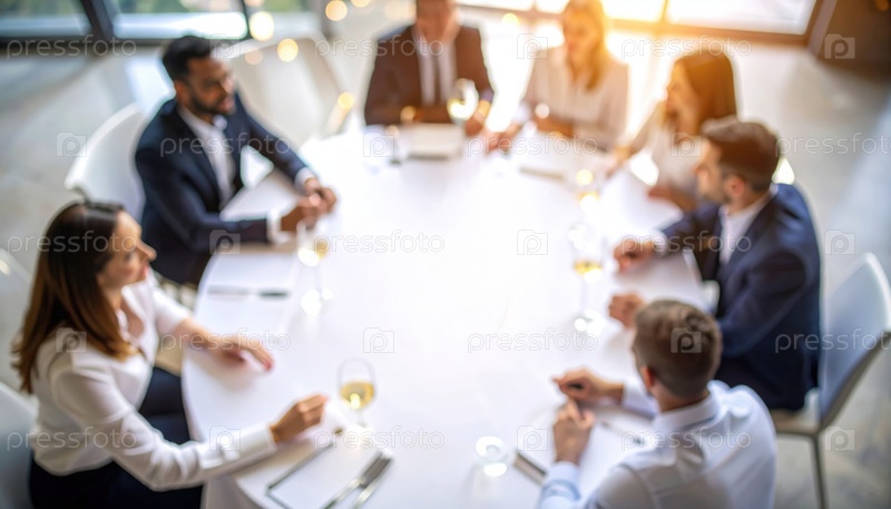 Размытое деловое совещание вокруг круглого стола, отражающее энергию профессиональной командной работы и стратегического планирования в корпоративной среде