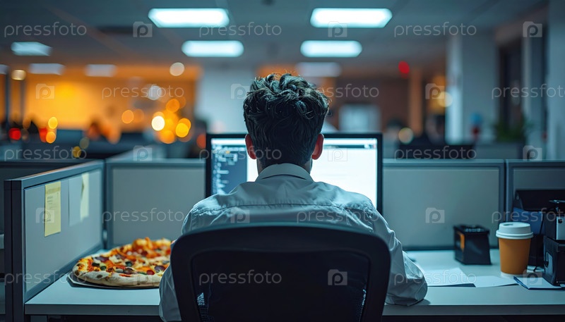 Мужчина работает допоздна в современном офисе с двойными экранами и пиццей, иллюстрируя ночные технологии или корпоративную рабочую культуру