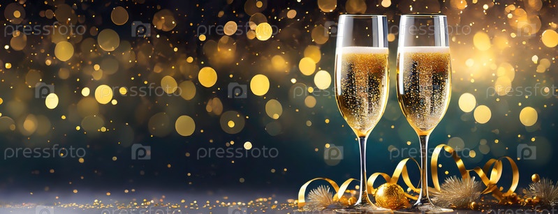 Два стакана шампанского сидят за столом с праздничными огнями боке на заднем плане, вызывая новогоднюю ночь или праздничную атмосферу