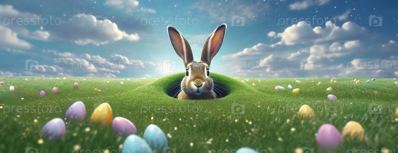 Странный кролик заглядывает из норы посреди поля пасхальных яиц.Скрытое среди зеленой травы существо выглядит как нежный час весеннего наслаждения