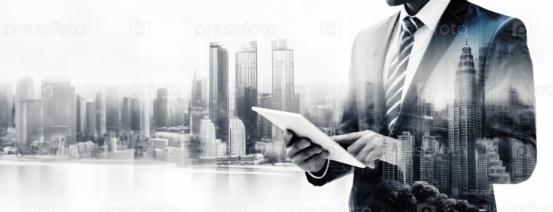 Бизнесмен смешивается с городским ландшафтом. Силуэт профессионала пересекается с городскими структурами, обозначая динамичную деловую среду. Фигура компании плавно сливается с горизонтом, оживленной жизнью города