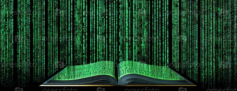 Открытая книга лежит на фоне цифрового матричного кода, символизирующего слияние традиционных знаний и цифровой эпохи.Панорама с копировальным пространством.Зелёные символы