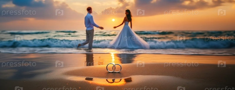 Пара гуляет вдоль пляжа на закате с свадебным костюмом и кольцами на переднем плане