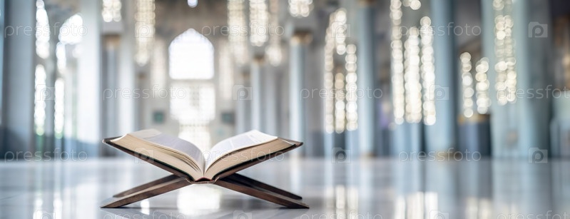 Коран в тихой мечети. Открытая священная книга Корана с солнечным светом, проходящим через окна, спокойное и созерцательное пространство для преданности во время Рамадана. Святой месяц Ид аль-Фитр