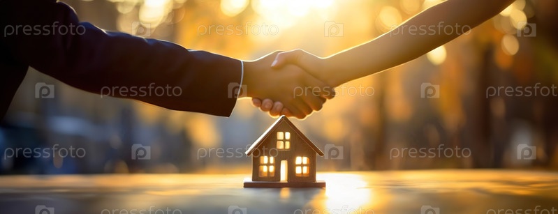 рукопожатие над типичным домом, представляющее собой договор о недвижимости на закате. риэлтор заключает сделку с клиентом покупателя. панорама со копировальным пространством