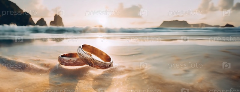 Кольца улавливают мимолетный солнечный свет, символизируя вечные связи с необъятным океаном.Золотые обручальные кольца отдыхают на берегу, омываются мягкими морскими волнами при закате.Обеспечивают сюжет дня