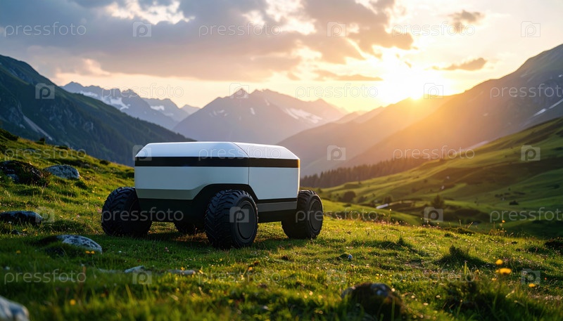 Автономный робот-доставщик, движущийся по отдаленному зеленому ландшафту на закате солнца, символизирует будущую логистику, экологическую гармонию и доступ к сельской местности