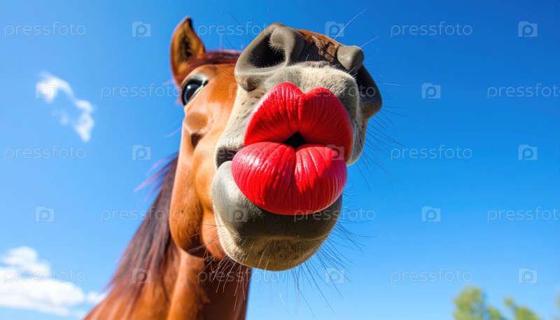 Лошадь с огромными красными губами создает юмористическую и сюрреалистичную визуальную концепцию, играя с антропоморфизмом и абсурдом в фотографии портретов животных