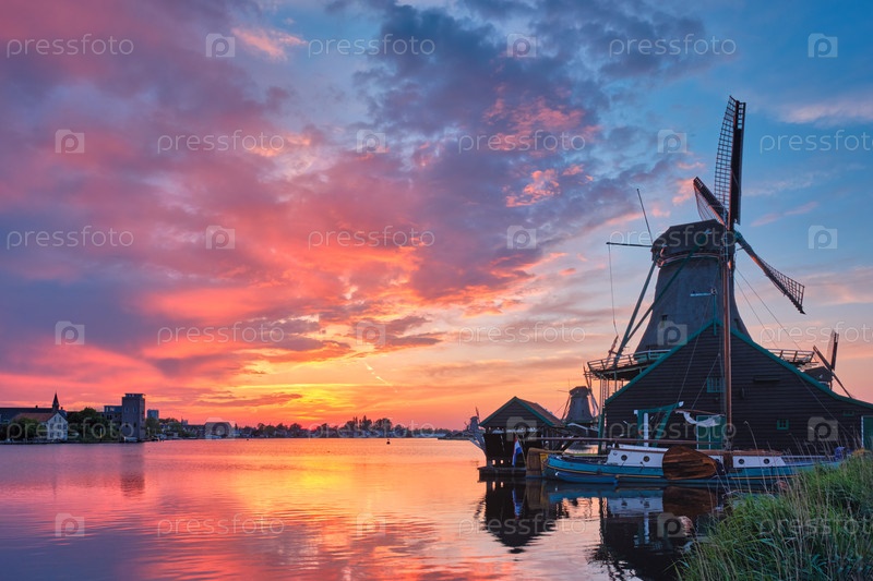 Ветряные мельницы в Заансе-Шанс в Голландии на закате