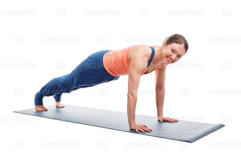 Женщина, практикующая йогу puna Uthita chatranga Ухита чатранга Дададана или фауана