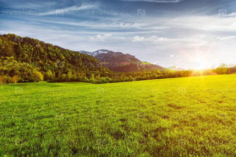 Пасторальная полевая луга в баварских Альпах, Бавария, Германия. с утечками света и мигающими линзами