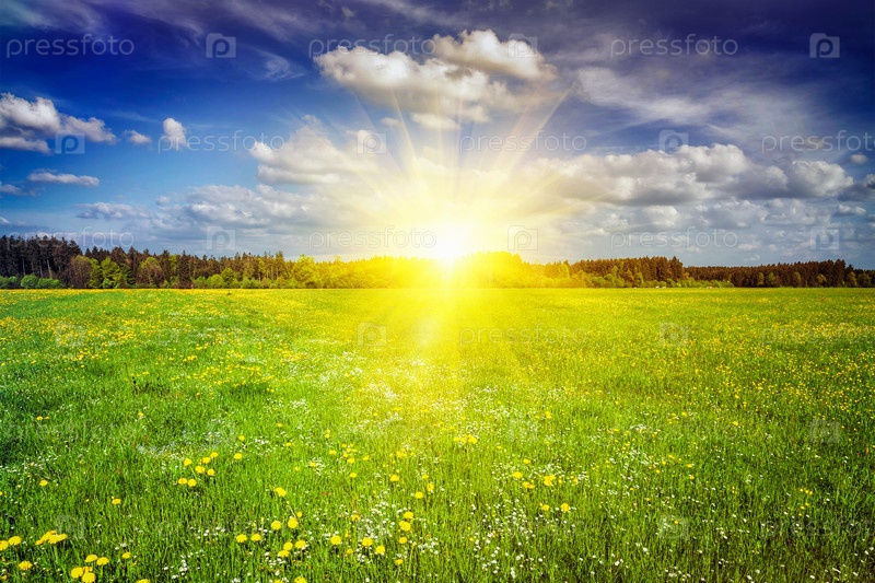 Летний луг на закате с голубым небом и солнечным светом. со вспышкой линзы и утечкой света
