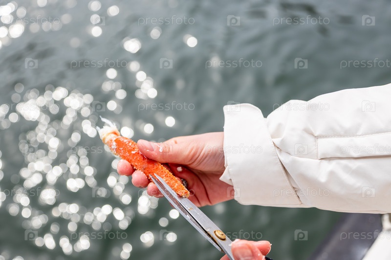 Рыбак отрезает ногу пойманного краба ногами