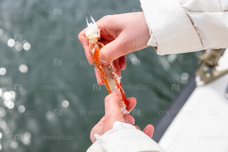 Турист открывает ногу недавно пойманного краба на лодке