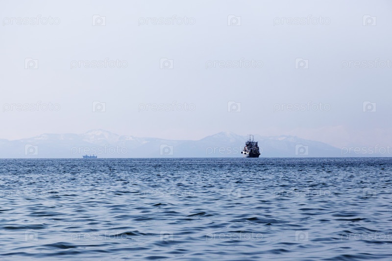 Корабль в бухте Авача во время синего весеннего сумерек