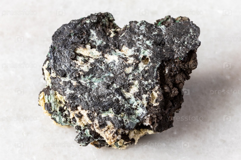 Образец сырого минерала тенорита на белом мраморе