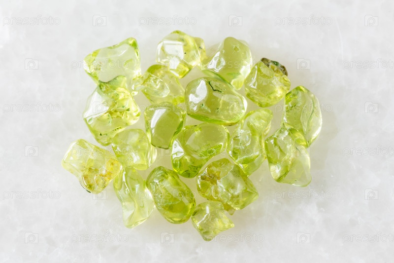Образец многих кристаллов перидота на белом
