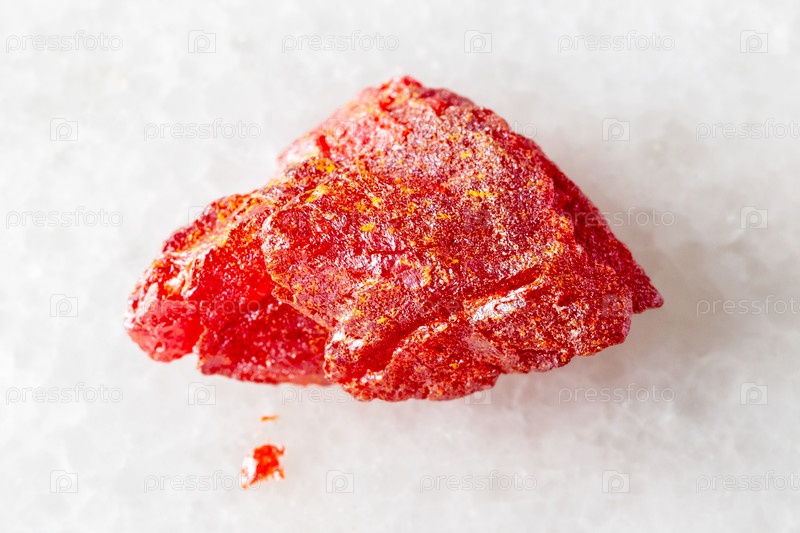 Образец сырого минерала реальгар на белом мраморе