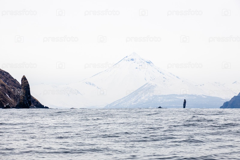 Скалы возле бухты Авача, снежное горное побережье