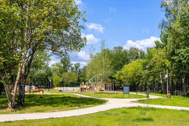 Пешеходные тропы и детская площадка в парке летом