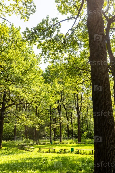 Солнечно-зеленый луг с скамейками в дубовой роще