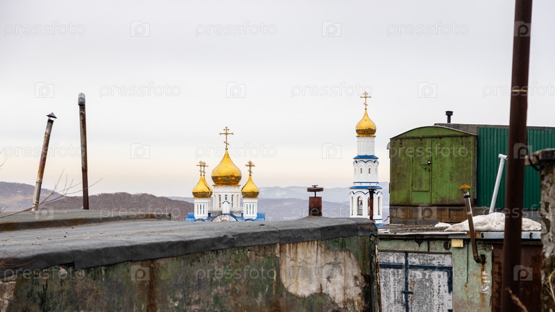 Петропавловск-Камчатский городской пейзаж с церквями