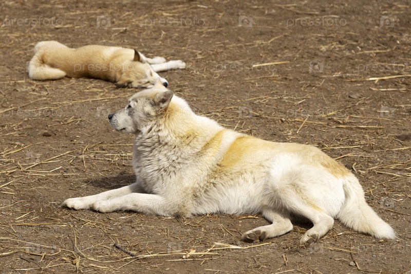 Две лежащие собаки во дворе сельского хозяйства в Камчатке