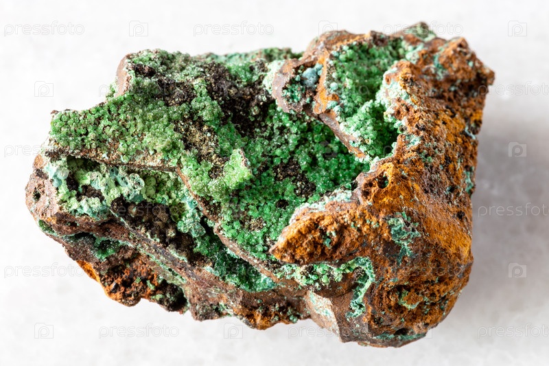 Кристаллы конихалцита на лимонитном скале на белом