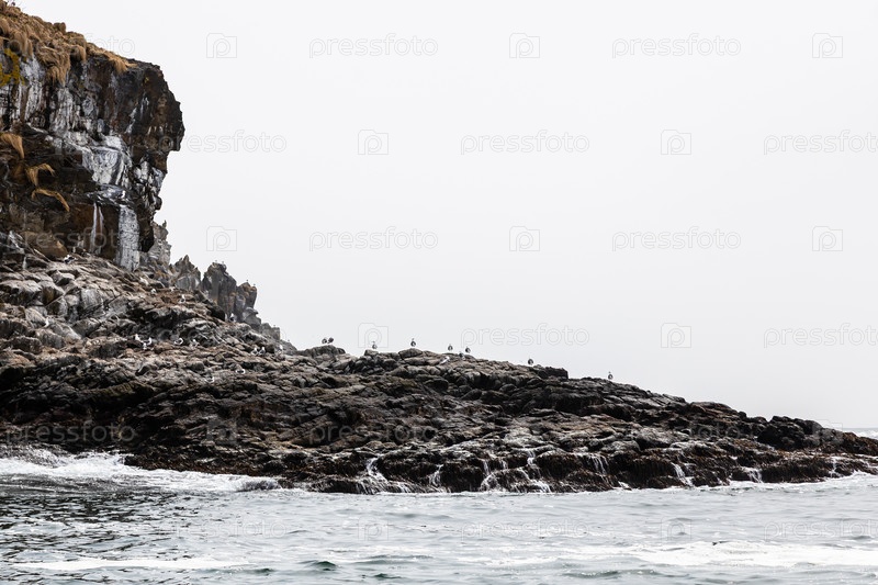 Морские птицы на берегу острова в заливе Авача