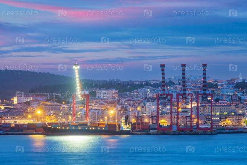 Порт Лиссабона с кораблями и портовыми кранами вечером