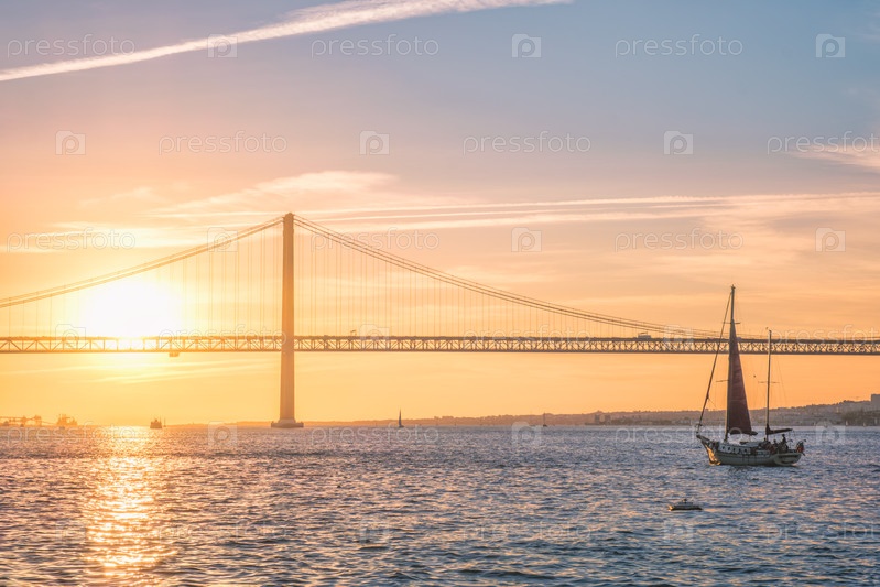 Вид на мост 25 апреля над рекой Таго при закате солнца.Лиссабон, Португалия