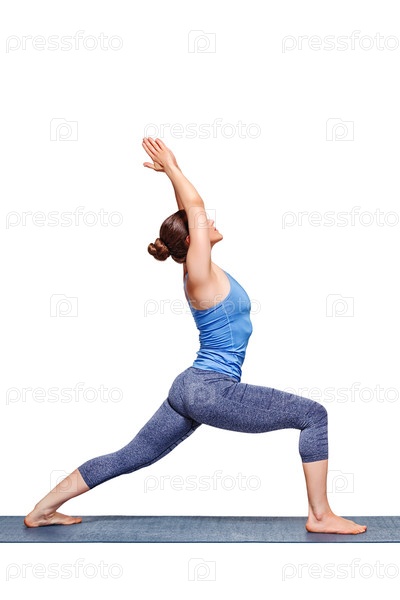 Спортивная фит yoga woman practices yoga asana utthita Virabhadras Женщина, занимающаяся йогой