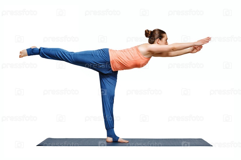 Красивая атлетическая женщина практикует асану йоги Virabhadrasana 3 - воин 3 позы изолированы на белом