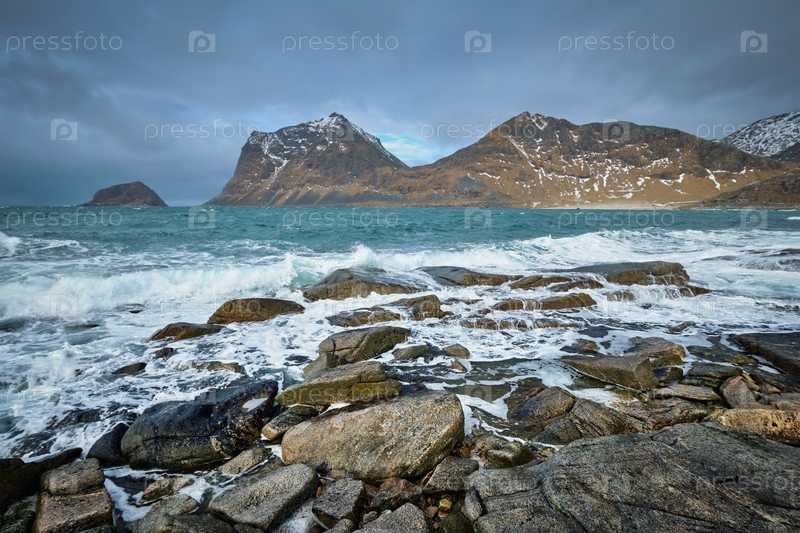 Каменистое побережье фьорда Норвежского моря зимой.Острова Лофотен, Норвегия