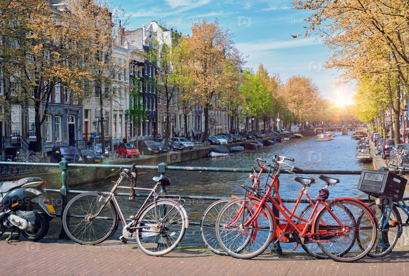 Амстердамский городской пейзаж с каналом, мостом с велосипедами и средневековыми домами