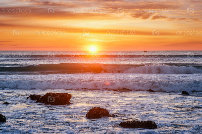 Закат Атлантический океан с волнами и скаллами.Коста-да-Капарика, Португалия