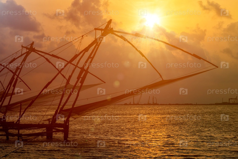 Кочинские рыболовные сети при закате солнца в Форт-Кочина, Кочи, штат Керала, Индия