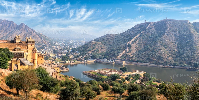 Индийское путешествие известная туристическая достопримечательность - панорамный вид на Форт Амер (Янтар) и озеро Маота, Раджастхан, Индия