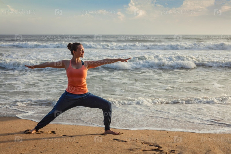 Женщина, практикующая хата-йогу асану Вирабхадрасана 1 Воин позирует на открытом воздухе на пляже океана при закате солнца