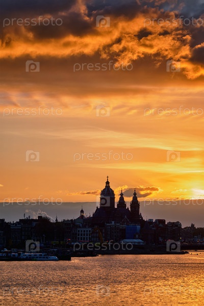 Амстердамский городской пейзаж с церковью Святого Николая (Sint Nicolaasquerk) на закате с драматическим небом